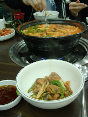 I med tjocka nudlar i grytan. Med metallpinnarna tog det en stund innan jag fick in tekniken och inte tappade ner nudlarna igen i grytan och skvätte röd sås på alla tröjor runt mig. Det är konstigt här i Korea, desto dyrare mat desto mer lagar man och fixar vid bordet. Skojsigt!